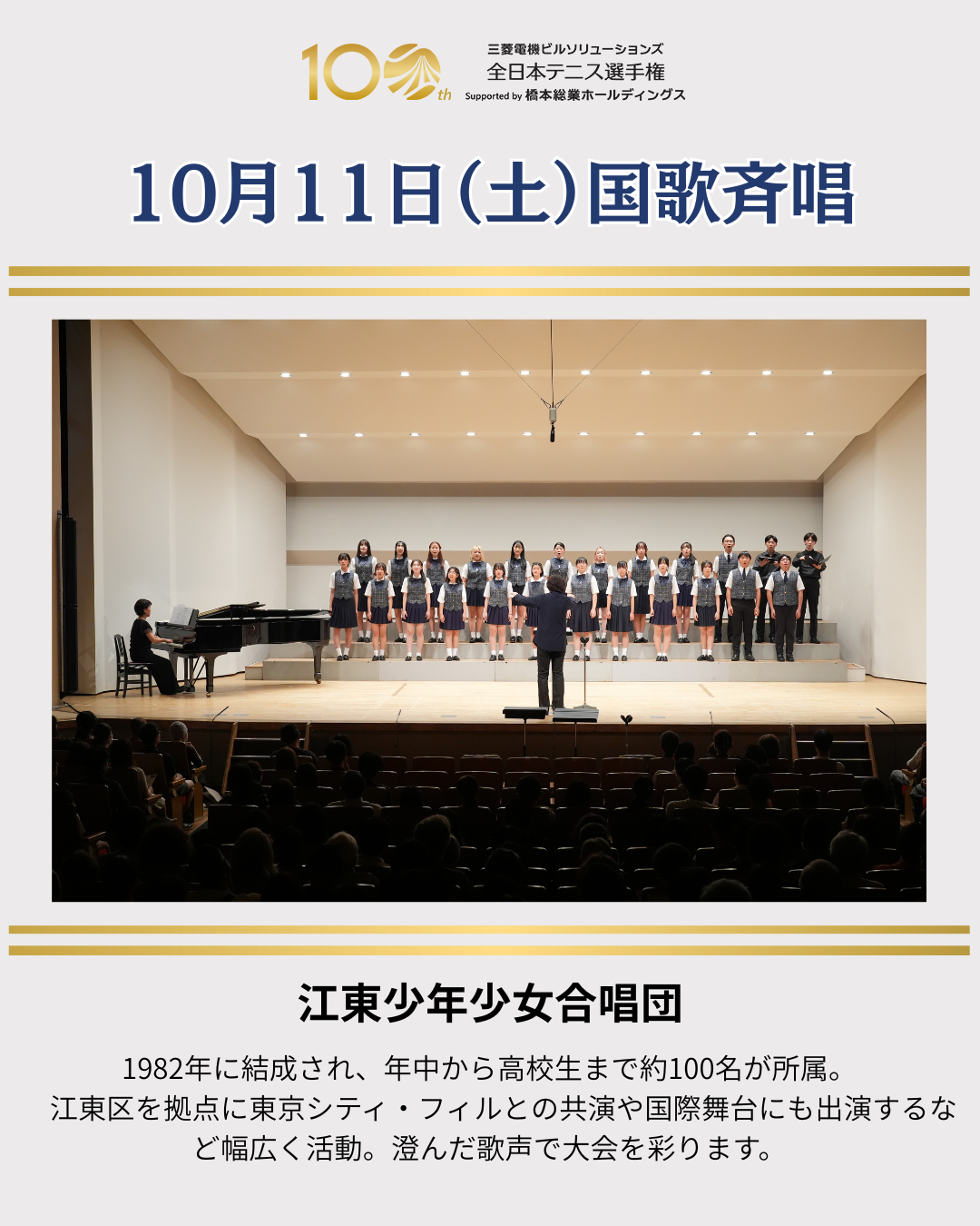 最後の2日間、江東少年少女合唱団(10月11日(土))と川合結人さん(10月12日(日))による国歌斉唱を行います