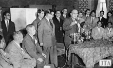 念願のデ杯東洋ゾーンが実現し、日本対フィリピンの決勝が東京で行われました。日本で初のデ杯開催です。日本チーム(監督:原田武一、選手:宮城淳、加茂公成)はF.アンポン、R.ディロを柱とするフィリピンを破りました。その後、米国で行われたインターゾーン準決勝ではオーストラリアを越えることはできませんでしたが、米国各地の大会で好成績をおさめ、全米ダブルスで優勝しました。戦後日本選手の海外経験がようやく実った結果とも言えるでしょう。