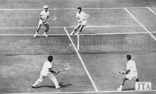 8月15日、終戦。畑になっていたコートにも活気が戻ってきます。11月には日本庭球協会の再興総会で勝田永吉が再び会長に選任され、協会は活動を再開することになりました。戦後しばらく除名されていた国際庭球連盟には、1951年からのデ杯復帰が認められます。13年ぶりに北米ゾーンに参加して米国チームと対戦した日本チーム(監督:熊谷一彌、選手:隈丸次郎、中野文照、藤倉五郎)はブランクの大きさを実感しました。デ杯復帰後は海外協会との交流も次第に多くなります。また、1954年には読売新聞社の招きで米国からJ.クレーマーら男子プロ4選手が来日し、最先端のプレーを披露していきました。